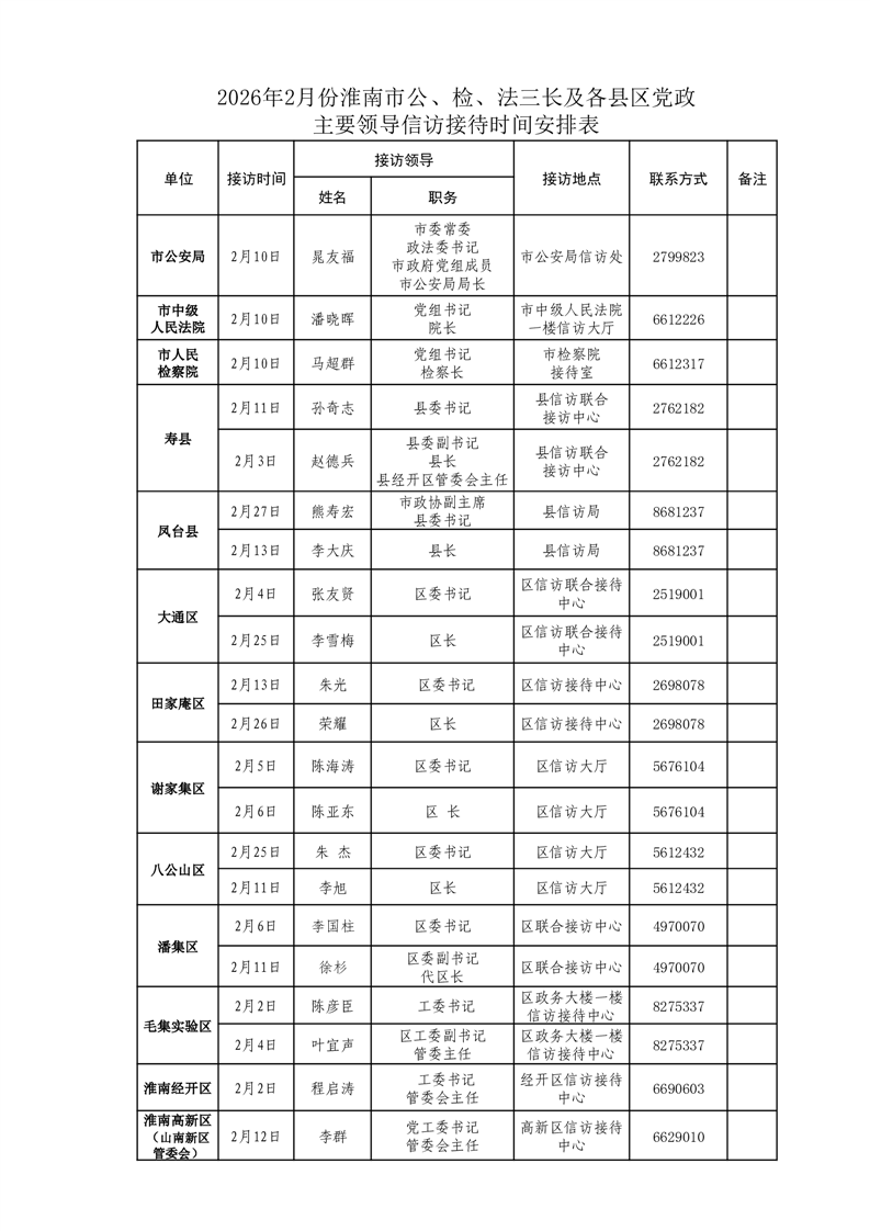淮南市2026年2月份各县区主要领导及公、检、法三长接访时间安排表
